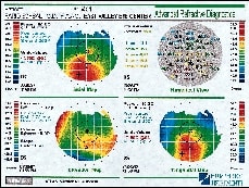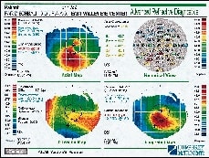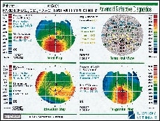 ![]() FIG. 2c: THE SAME EYE OF THE PATIENT IN FIG. 2b ONE WEEK AFTER DISCONTINUING CONTACT LENS WEAR. THE SAME POINT ON THE ELEVATION MAP NOW SHOWS A LOWER NEGATIVE VALUE (-4.4 MICRONS), AND THE AXIAL MAP SHOWS A 2.30D FLATTENING IN CURVATURE. |