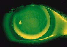 If the fluorescein pattern demonstrates excessive mid-peripheral bearing (steep fitting relationship), then the lens may not achieve unobstructed movement along the vertical corneal meridian when the patient looks down to read. Choosing a base curve 0.1mm flatter should improve translation.