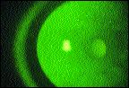 These small, translucent interepithelial cysts initially form at the level of the basal epithelial cells following about three months of extended wear. On indirect retroillumination, the lesions appear as fine, round vesicles which are uniform in size and shape. They are thought to be comprised of disorganized basal cells, the walls of which have been compromised by prolonged corneal hypoxia. The microcysts eventually migrate toward the surface and break through the epithelium. Expulsion of the microcysts results in small, round epithelial defects which can be detected easily with fluorescein (Fig. 2). You can determine the degree of hypoxia experienced during extended wear by quantifying the level of microcyst development. The fact that microcysts take several months to develop and to disappear after discontinuing lens wear suggests that some alteration in corneal epithelial function occurs.