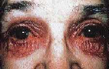 Symptoms intensify in the winter months and include itching, burning, mucoid discharge, redness and photophobia. The clinical signs are a milky conjunctiva, papillary hypertrophy, erythema of the lid margins (Fig. 6), scaly/infiltrated lids, crusting between and around the cilia, increased wrinkling of the skin around the eyes and corneal changes (pannus, ulceration, scarring, keratoconus, punctate epithelial keratitis). Cicatrization, giant papules and papillary hyperemia are representative of a chronic state. Cataracts, retinal detachment and perhaps keratoconus are some of the more serious adverse sequelae of long-term AKC. Cataracts are associated with the disease and the use of corticosteroids. Keratoconus and retinal detachment may be a result of vigorous eye rubbing.