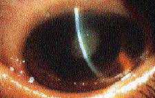 Contact allergy can either be an immediate or delayed hypersensitivity to substances that come in contact with the eye or surrounding tissue. Potential sensitizers include common items like cosmetics, hair sprays, nail polish, detergents, after-shave lotions, sunscreens and various household and industrial agents. Common outdoor sensitizers include poison ivy and poison oak. Most contact allergy reactions are iatrogenic, most likely a Type IV hypersensitivity, but the distinction between a Type I drug hypersensitivity and a contact allergy may not be clinically apparent. For example, certain drugs, like anesthetics, atropine-like pharmaceuticals and the antibiotics tobramycin, gentamicin and neomycin induce an immediate hypersensitivity reaction. The result is a watery, itchy, papillary response with prominent eosinophils. A delayed hypersensitivity is more apparent with drugs like thimerosal, epinephrine, dipivefrin, vidarabine and idoxuridine. This reaction is characterized by less itching, little discharge, few eosinophils and follicles. If untreated or exacerbated, contact allergy can exhibit an intensely red conjunctiva, moderate edema, macerated skin of the eyelids and margins, defects on the corneal surface (Fig. 7) and possible conjunctival scarring and corneal thinning (corneal melting in the case of topical drug abuse).
