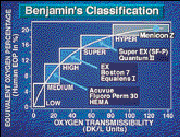 In 1993, Dr. William "Joe" Benjamin published his classifications of oxygen permeability and transmissibility standardized by ranges of equivalent oxygen percentage (EOP) (Fig. 1). Until the release of high Dk soft lenses, only RGP contact lenses could provide EOP values in Benjamin's super- and hyper-transmissible classifications. The EOP value of a material, developed by Richard Hill O.D., Ph.D., is the oxygen percentage (on a scale of 0 to 21, where 21 is the percentage of oxygen in the air) that produces a corneal "oxygen thirst" equal to that which is produced after wearing the test contact lens.