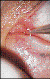 FIG. 3: Inserting a collagen rod into an undilated lower punctum under slit