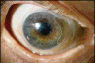 ![]() FIG. 1: Corneo-scleral RGP lens on patient's right eye.