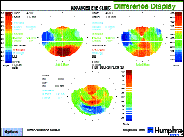 FIG 1: Topography shows corneal warpage steepening and ghosting (upper images). Refit corneal warpage can be seen on the difference map (lower