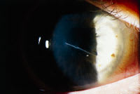 Patient C. H., a 39-year-old machinist, suffered a 4mm corneal laceration and penetrating metallic foreign body to his right eye in 1998 (Figure 1). The laceration was surgically repaired the day of the injury, with subsequent parsplana vitrectomy / lensectomy and removal of the foreign body five months later (Figure 2). With an aphakic soft lens OD, the post-operative visual acuity was best corrected to 20/70, while the left eye remained 20/15 without correction.