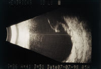 | Figure 1. Full thickness corneal laceration OD. | Figure 2. B-Scan identification of the intraocular foreign body. |