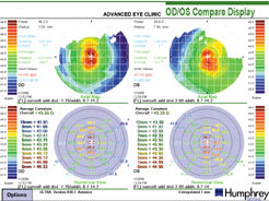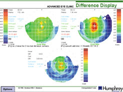 The difference map (Figure 2) shows a central green to red zone approximately 3.5 mm in diameter that corresponds to the strongest plus power of the lens. The lens periphery appearing primarily in blue represents the distance power of the lens. The patient's spectacle correction was 1.75D sphere with a 2.25D add. The lens placed on the eye was a 1.75C, which corresponded to the appropriate distance and near correction for this patient. Note that the lens add power is geometrically centered over the pupil and the patient's line of sight. This is the proper lens position for an aspheric design.