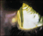 A decentered gas permeable lens can wreak havoc on the eye. The most threatening situation is a low riding lens, which often does not move sufficiently. Most patients with chronically low riding riding lenses display a partial blink. The inferior aspect of the lens tips in as the lens aligns with the lower cornea surface, which in turn tips out the top portion of the lens (Figure 1).