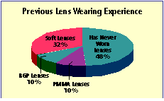 Park Nicollet evaluated the Visions lens on a group of 40 patients (79 eyes total). The study included 25 females and 15 males, ranging from 11 to 62 years of age. The greatest representation of the candidates (35 percent) fell within the 11- to 18-year-old group. Some 48 percent of the patients had never before worn contact lenses (Figure 1).