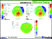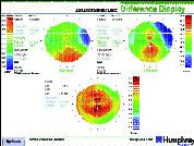 Using the Difference Display to track these changes is the easiest way to visualize progress. Figure 1 compares a normal cornea sphericalized from years of RGP lens wear to the same eye after three months of nonwear. While a slight with-the-rule astigmatism (-1.62cx006 FM 43.37) is visible after contact lens wear, it is reduced compared to non-wearing levels (-2.50cx008 FM 44.25). The cornea steepened by over 2.50D inferiorly after lens removal. The contact lens-induced flattening effect can be easily seen from the large area of steepening visible from the Difference Map. Until repetitive maps show no significant difference, surgery should not be scheduled. Figure 2 shows the stability achieved after discontinuing lens wear for nine weeks. The Difference Map (bottom) is uniform in color and mostly green, suggesting no significant difference between the two topography maps.