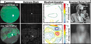 The researchers in Dr. Larry Thibos's lab at the Indiana University School of Optometry used a Hartmann-Shack wavefront sensor to study the optical aberrations caused by tear film break-up. The wavefront sensor images hundreds of points of light across the pupil and measures their deviations from normal.