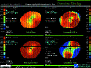 In Figure 1, axial and tangential keratoconus maps are displayed. Centrally, the red steep zone will be close to the relative "peak" of the cornea, but in the mid and far periphery, the steep area will actually pool fluorescein underneath a spherical RGP lens because it's lower than the reference sphere. Figure 2 illustrates the dramatic difference in the interpretation of the red zone on a post-penetrating keratoplasty patient. Note the upper left axial curvature map, which displays significant peripheral corneal steepening relative to the center of the map at the 4 and 10 o'clock zones. On the lower left elevation map, these same areas are depicted as relative low zones on the corneal surface.