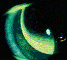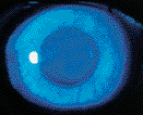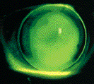 Other potential risks with RGP extended wear involve the fitting characteristics of the lens. One of the more serious complications is lens adherence, characterized by a non-mobile lens upon awakening. Although the incidence of clinically significant lens adherence ranges between 10 to 22 percent, the consequences can sometimes lead to corneal distortion or even ulceration. Like corneal edema, actual lens adherence is often undetected by clinicians unless examinations are performed soon after awakening. However, lens adherence may cause a characteristic inferior arcuate staining pattern, and the astute clinician will discover this subtle finding with careful slit lamp examinations.