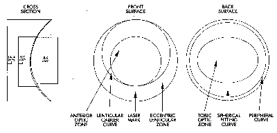 The prism ballast design (Figure 1) is incorporated in the majority of currently available toric soft lenses. The prism effect may be attained by eccentric lenticulation or by incorporating a prism in the lenticular or carrier portion of the lens peripheral to the optic zone. Also, several manufacturers incorporate a comfort chamfer around the entire circumference of the anterior surface lens edge. This comfort chamfer is accomplished by thinning the edge profile, thereby reducing inferior lid interaction which could decrease rotational stability.
