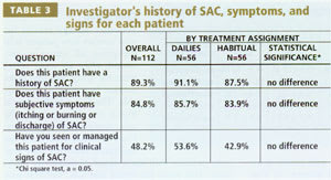 At baseline, patients filled out a symptom history questionnaire, and investigators took additional history from interview and patient files to confirm that each patient had symptoms, signs or history of SAC. In the symptom questionnaire, patients were asked how often they experienced specific SAC-related symptoms. The study groups were compared for differences in these symptoms and no difference was found (Table 2). The investigator's history of each patient's SAC was also compared for the study groups and no differences were found (Table 3). Other patient profile information is given in Table 4. The profile characteristics for each study group were also compared and no statistically significant differences were found.