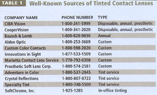 Other prosthetic lenses are custom tinted. Alden Optical, Custom Color Contacts, Innovations in Sight, Marietta Contact Lens Service, Prosthetic Soft Lens Corp., Adventures in Color, Crystal Reflections and Specialty Tint offer custom lenses (Table 1). Hand- painted lenses are based on a photo of the patient's eye. Lighting is important when taking the photograph because the eye color can differ in the photo when compared to the natural eye. Black pupils can be tinted onto a lens as well. A higher water content lens, 55 percent, is best for the custom designs.