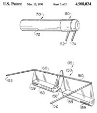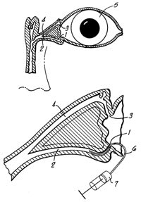 Py [1990] states in his patent: "Frequently the elderly are the recipients of ocular treatment. In general, the elderly may have poor near vision and may also suffer from tremors and finger arthritis. For this reason, when liquid medicament must be applied to the eyes of an elderly individual, it generally must be applied by a third party in 70 percent of all patients according to Kass." Py's device intends to facilitate self-administration and consists of a complex apparatus attached to a spectacle frame (Figure 5). When a patient faces a mirror and rotates his/her eyes upwards, the prism shows the digitally everted lower cul de sac. Medication contained in the reservoir is delivered to the conjunctiva. The device seems rather bulky and presents difficulties in maintaining sterility in the reservoir.