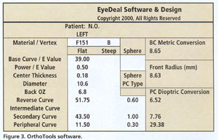 We designed a reverse geometry RGP lens using the OrthoTools software from EyeDeal Software in Fresno, CA. We entered into the program parameters such as base curve, power, diameter, optic zone, mid-peripheral fitting curve and peripheral curve. The software calculated the radius of the reverse curve, which in this case was 51.75 diopters (6.52mm) (Figure 3).