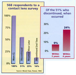 "Contact lens abandonment is a perplexing problem and one which the industry as a whole has been reluctant to tackle," says Desmond Fonn, professor and director, Centre for Contact Lens Research, School of Optometry at the University of Waterloo in Ontario, Canada. "The most recent market research survey (1999) that I have seen suggests that there are approximately 10.5 million dropouts in the United States. This represents a huge loss in income to the eyecare industry."
