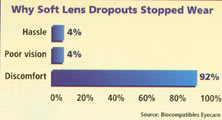 Mark André, FAAO, Director of Contact Lens Services, Oregon Health Sciences University, Portland, Ore., agrees, citing a more startling set of figures. "Between two and 2.2 million people drop out of contact lens wear annually, which equals almost 10 percent of the contact lens wearing population. That's a big annual failure rate," he says. "The reason the industry is not growing is because for every person coming in, there's one person leaving."