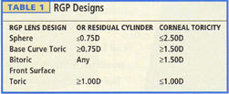 Spherical lenses work well for patients with 0.75D or less of residual astigmatism and less than 2.50D of corneal toricity. A toric back surface design is indicated dependent on the eyecare practitioner's fitting philosophy and other fitting variables such as corneal topography, lid structure and lid position. Rigid contact lenses fit lid attached may be suitable for patients with larger amounts of corneal toricity than intrapalpebral fits.