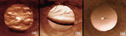 Tear quality over the lenses was measured by retroilluminating the tear film. To use this technique, the slit lamp beam is rotated close to the "on axis" position until you obtain a red reflex. Focus the optics of the slit lamp on the tear film. Any disturbance or variation in the normal thickness of the tear film appears as a shadowed, topographic-like image within the pupil. Figure 1a shows the tear film of one subject just after eye opening. The uneven surface in the retroilluminated image is due to tear film disruption on the lens surface. Figure 1b was taken about 15 minutes later, when the lens was sticking to the upper lid with blinking and was pulled superiorly. The dark arc across the pupil is the edge of the decentered lens. Figure 1c shows the same patient approximately one hour later. By then, the tear film was evenly spread over the surface of the lens, the lens was no longer sticky, and it was centered and fitting well.