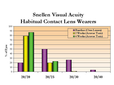 Table 2 summarizes Snellen visual acuity results for the entire subject group and indicates that at baseline, only 35 percent of all eyes achieved 20/20 vision with their habitual correction. At the two- and four-week follow-up visits, 78 percent and 84 percent respectively of eyes corrected with Acuvue Toric lenses achieved 20/20 vision. Acuvue Toric lenses provided a statistically significant (p<0.001) improvement in Snellen visual acuity at both the two and four week study visits, when compared to the subjects' habitual vision correction.