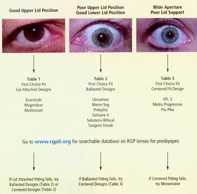 Alternating RGP multifocal designs are available that can be fit lid-attached and rest in a superior position on the eye. Lid-attached fitting is my preferred technique and represents the majority of my current RGP patients.Therefore, I am inclined to begin with this type of bifocal as it is easy to convert current wearers and is consistent with my general fitting philosophy for new wearers. For patients who are currently fit intrapalpebrally due to wide apertures/high upper lid positions or non-lens wearers with similar lid anatomy, I will fit a prism-ballasted alternating bifocal design if lower lid support is sufficient. If the lower lid is too low to support a ballasted lens or too high so that the lens rests too high, then I will fit a simultaneous RGP bifocal that generally requires a centered fitting approach.