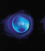 Case Example 2. An 85-year-old-female sustained chemical injury as a young woman while imprisoned in a Nazi camp during WWII. She was unable to rinse her eyes, so the chemical contact was sustained for days (Figure 7). Acuity with glasses was OD 20/100 OS 20/80. There were early lenticular changes present, as well. She kept PMMA lenses from many years ago that improved her vision but hurt her eyes. She wished to be refit so she could read music and play the piano. VA with her present 20-year-old PMMA lenses: OD 20/80, OS 20/40. I refit her in RGP lenses (Figure 8), which were able to distribute the weight-bearing forces more evenly. Increased edge lift aided in tear circulation. The patient was able to achieve eight to 10 hours a day of comfortable wearing time, which just thrilled her. Final VA was OD 20/80, OS 20/30-.