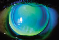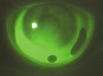 The final lenses, which he has worn successfully for three years, were the OK-4 lens by Contex. Fluorescein pattern revealed a near-alignment pattern centrally that changes to minimal clearance at the end of the flattened central area. You see alignment mid-peripherally with good edge lift. The lens positions superiorly under the eyelid and exhibits excellent tear exchange on the blink.
