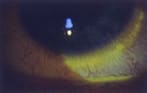 Three and nine o'clock corneal staining (Figure 2) affects an estimated 40 to 90 percent of RGP contact lens wearers. The peripheral desiccation almost certainly results from blink inhibition, which is most likely due to discomfort. RGP lens wear causes accelerated tear film evaporation and decreased Tear Break Up Time (TBUT), which leads to peripheral corneal desiccation and damage and staining of the epithelial cells. This would naturally result in limbal and bulbar conjunctival hyperemia, as shown in Figure 3. The symptoms of these patients are discomfort and dryness and redness towards the end of the wearing period. Unfortunately optimizing the design and fit does not always alleviate the discomfort for RGP patients. Switching to soft lenses almost certainly improves comfort and definitely eliminates 3 and 9 o'clock staining.