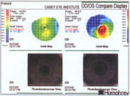 Figure 1. Corneal mapping clearly demonstrates the unilateral keratoconus OS. |