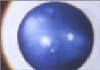 The more severe the disease, generally the more obvious the signs and symptoms. Symptoms may include increased glare, distorted and reduced vision and diplopia. The patient may reveal a family history of keratoconus, allergies and atopic conditions, as well as frequent spectacle prescription changes due to dissatisfaction with vision. Irregular retinoscopy and ophthalmoscopy reflexes are usually present. Keratometry reveals irregular mires with generally steeper findings. Topography shows a steeper inferior cornea when compared to the superior cornea. Slit lamp signs may include Vogt's striae, Fleischer's ring (an iron deposition at the base of the cone) and corneal scarring (Figure 1). Keratoconus is typically a progressive, bilateral and asymmetric condition.