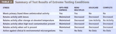 Of the products tested, Opti-Free Express demonstrated a higher capacity to kill micro-organisms under environmental stress or misuse conditions than did competitor products ReNu MultiPlus, SoloCare and Complete (Table 2). Moreover, SoloCare and Complete both fail Stand Alone criteria because of inactivity against fungi (yeast and mold).