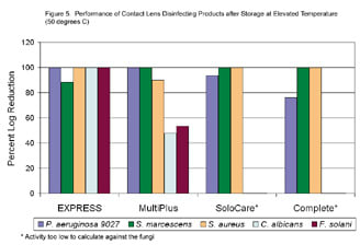Contact lens disinfecting products are not always stored under ideal conditions. To simulate extremes that may be encountered, all products were stored at elevated temperature of 50 degrees C (approximately 121 degrees F) for one week. Products were also stored at room temperature (approximately 25 degrees C) for one week as a control. The products (10 ml) were challenged with 0.1 ml of approximately 1x108 CFU/ml of P. aeruginosa ATCC 9027, S. aureus, S. marcescens, C. albicans, and F. solani. The final concentration of the micro-organisms in the final product was approximately 1x106 CFU/ml. No organic soil was used in this study. The percent log reduction was calculated as [ a / b * 100 ]; where a = log reduction of the product at elevated temperature and b = log reduction when stored at room temperature. The results show that the antimicrobial activity of Opti-Free Express was retained at elevated temperature (Figure 5). ReNu MultiPlus, SoloCare and Complete multi-purpose solutions maintained bactericidal activity at elevated temperature. However, ReNu MultiPlus showed less antifungal activity after storage at elevated temperature. The antifungal activity of SoloCare and Complete multi-purpose solutions was too low to evaluate. Opti-Free Express maintained similar antimicrobial activity compared to baseline against all five organisms when stressed by elevated temperature.