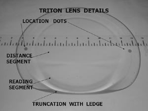 To fit the Triton lens correctly, you must use a Triton trial fitting lens. The most important aspect of the fitting is the overall size of the lens in the vertical meridian, as this sets the position of the reading portion of the lens correctly for optimal vision for the patient. Once you determine the correct vertical lens size, calculate the base curves and powers empirically.