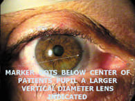 Use a smaller vertical size lens if the lens marker dots are higher than the center of the patient's pupil (Figure 3). Use a larger vertical size lens if the marker dots are lower than the center of the patient's pupil. If the lower lid falls below the limbus, use a larger vertical size lens so the lens will engage the lid and allow translocation (Figure 4).
