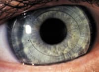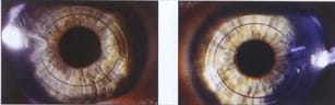 Patient JK is a 40-year-old male with a longstanding history of keratoconus OU. The patient had been wearing RGP lenses for 18 years and was interested in an alternative corrective option due to increasing lens awareness. In 2000, he underwent bilateral implantation of the intra-stromal Intacs rings (Figures 1a and 1b). The two PMMA arched segments are designed to flatten the central cornea by altering the peripheral corneal angle (Figure 2).
