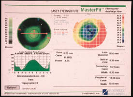 Topography is a great fitting aid. Use the curvature just outside the ablation zone (4mm temporal from center) as the base curve of the conventional lens or the peripheral zone curve of the reverse geometry lens (Figure 5). The central curve of the reverse geometry lens is often three to four diopters flatter. The optic zone of the lens should be just a bit larger than the ablation zone, 6.5mm to 7.0mm.