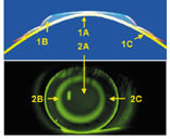 curve (Figures 1a, 2a), then a significantly steeper reverse curve zone (Figures 1b, 2b), an alignment area that is steeper than the base curve (Figures 1c, 2c), then a flat posterior peripheral curve zone. Each part of the lens plays a role in the corneal reshaping process of orthokeratology.