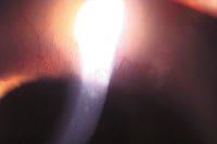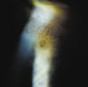 Superior epithelial arcuate lesions SEALs (Figure 7) present as a thin arcuate lesion in the superior cornea, with significant overlying staining and occasional underlying diffuse infiltrates. The edges of the lesion are often irregular and may be slightly roughened or thickened. Approximately one third are asymptomatic in silicone hydrogel EW, with the most common symptom being foreign body sensation or irritation. Approximately 40 percent have underlying infiltrates, and a third exhibit stromal glow of fluorescein. Time of occurrence of the first event varies widely; for example, in studies at the CCLRU, the time of onset has ranged from one to 20 months.