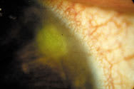 Contact lens-induced peripheral ulcer CLPU (Figure 1) is a circular, well circumscribed, dense, yellowish-white, focal corneal infiltrate (0.2-2.0mm in diameter) with an overlying epithelial defect that stains with fluorescein, with diffuse infiltration of the surrounding stroma in its active stage. It is located in the peripheral to mid-peripheral cornea. CLPU is characterized by marked limbal and bulbar redness, usually localized to the quadrant adjacent to the lesion. Redness is the most common symptom reported by the patient, followed by pain or soreness, irritation or watering. CLPU is usually unilateral and typically features a single focal infiltrate; however, a number of infiltrates can occur, although this is rare. In severe cases, there may be mild anterior chamber involvement and photophobia. In mild cases, a patient may be asymptomatic and present to the clinic only with a scar as indication that an event occurred. CLPU can mimic early MK; however, CLPU symptoms are milder and begin to recede immediately on discontinuation of lens wear. The events usually resolve in a characteristic bulls-eye scar (Figure 2). The patients who present to our clinics with healed peripheral circular scars without treatment highlight the self-limiting nature of CLPU events.