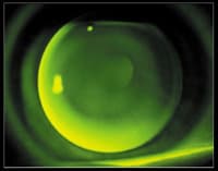 Patient SE is a 28-year-old male with a six-year history of bilateral keratoconus. The patient had historically been a good GP wearer until approximately six months ago when he began to experience discomfort and a loss of wearing time with the right eye only (Figure 1). Slit lamp examination revealed that both lenses were moving well with a slightly low resting position OU (Figure 2). We made a number of attempts to optimize the fit of the right lens, but all failed to resolve the patient's lens awareness symptoms. We eventually fit the patient with a piggyback lens system that consisted of a Focus Night & Day (CIBA) soft lens and a Paragon HDS 100 GP lens.