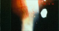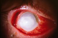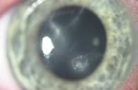 Clinical characteristics consistent with microbial keratitis include stromal infiltrates, anterior chamber inflammation, a decrease in visual acuity and significant subjective pain. Stromal involvement is usually central or paracentral, is diffuse and extends deep into the stroma (with the exception of early ulcers). Most of the time, an overlying epithelial defect is present, but this is not always the case. Culture-positive cases of microbial keratitis without the presence of an epithelial defect have been reported with both Gram positive and negative organisms. Other stromal changes present include corneal thinning (which can thin to perforation), edema, necrosis (Figure 1) or neovascularization (Figure 2). Dense corneal infiltrates can make assessment of the anterior chamber inflammation difficult, but cell, flare and hypopyon may be present and result in miosis and posterior synechiae.