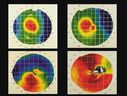 Keratoconic corneas may be topographically classified as nipple, temporal, oval and globus (Figure 1). The nipple form manifests as a central ectasia approximately 4.0mm to 5.0mm in diameter. The small central conical area is surrounded by 360 degrees of essentially "normal cornea." These corneas may be susceptible to apical touch with GP lenses, resulting in excessive corneal staining and scarring.