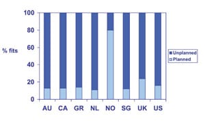 GP lenses were prescribed on a planned replacement basis in 59 percent of fits in Norway, and between 10 percent to 35 percent in all other countries (Figure 7). Some 14 percent of GP fits in Singapore were on an extended wear basis; this value was 4 percent for Australia and the United States, and 1 percent or less for the other countries (Figure 8).