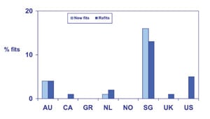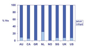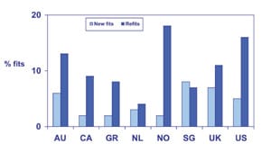 An important benchmark about the style of contact lens practice within a nation is the proportion of gas permeable (GP) lenses which are prescribed. For new fits, this parameter was highest in the Netherlands (25 percent of fits) and lowest in Norway (1 percent of fits) (Figure 1). For refits (lenses prescribed to existing wearers), the values were generally greater. For example, in the United Kingdom, 20 percent of refits wore GP lenses compared with 8 percent of new fits. Overall, 12 percent of all contact lenses prescribed in this survey were gas permeable.