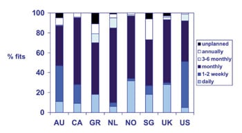 Daily disposable lenses were popular for new fits in Norway (32 percent), the United Kingdom (28 percent), Singapore (18 percent) and Greece (18 percent) (Figure 4). They accounted for less than one in 10 new fits in Canada (9 percent), the Netherlands (6 percent) and the United States (5 percent). Monthly-replaced lenses were the most commonly prescribed new fit replacement frequency, although one- to two-week replacement lenses were also popular in the United States (46 percent) and Australia (36 percent). Conventional (unplanned) replacements represented 11 percent of new fits in Greece, and less than 0.5 percent of fits in Canada, Norway and the United States.