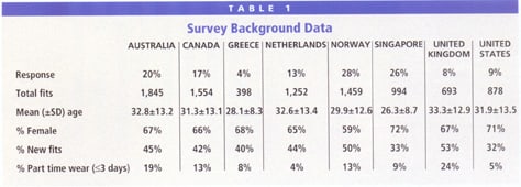 The response rate ranged from 4 percent in Greece to 28 percent in Norway. Overall, information was provided about 9,073 contact lens fits. Females accounted for 59 percent of fits in Norway and 72 percent in Singapore. The country with the youngest average contact lens fit age was Singapore (26.3 years), and the oldest was the United Kingdom (33.3 years). The proportion of new fits (lenses prescribed to patients with no previous experience) ranged from 32 percent in the United States to 53 percent in the United Kingdom. This parameter is an indirect measure of the health of the contact lens market, with higher levels of new fits suggestive of an expanding wearer base. There was considerable variation among countries in the number of patients for whom part-time contact lens wear (defined as using lenses three times per week or less) was prescribed. This modality accounted for 4 percent of contact lens wearers in the Netherlands and 24 percent of patients in the United Kingdom (Table 1).